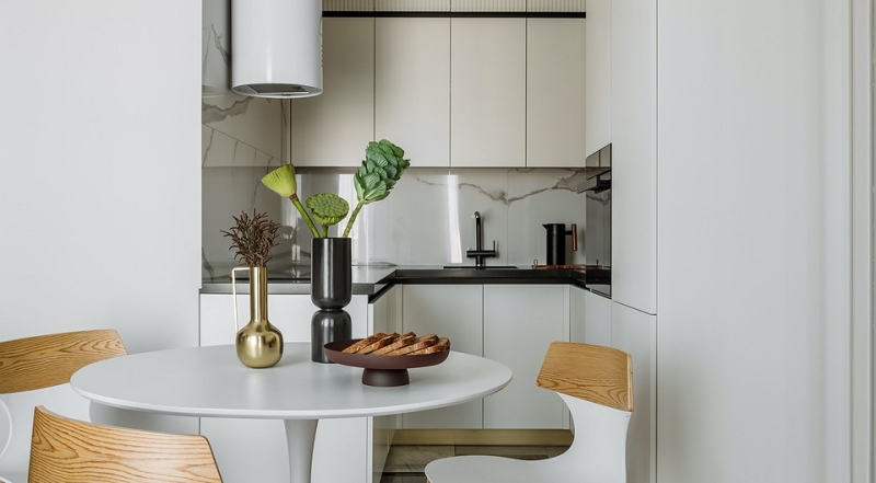 Компактную кухню (всего 4 квадратных метра) сделали П-образной. Одна из частей это высокие шкафы-колонны со встроенной техникой. Вторая верхние и нижние базы с мойкой и системами хранения. Третья нижние шкафы, здесь отказались от верхних модулей в пользу эффектной вытяжки каминного типа. Кстати, каркасы гарнитура выбрали в ИКЕА, для экономии, а вот фасады сделали на заказ, что придало индивидуальности.