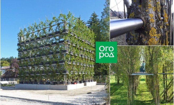 Строительные материалы переплетаются с живыми тканями растений. Как такое возможно? Сначала создается несущая конструкция из труб или других материалов, вокруг которой по периметру высаживают растения. По мере роста их закрепляют так, чтобы образовалась решетка. В итоге побеги срастаются в единое целое, с каждым годом становятся все крепче. Иногда искусственные материалы внедряют в живые ткани, чтобы усилить конструкцию.