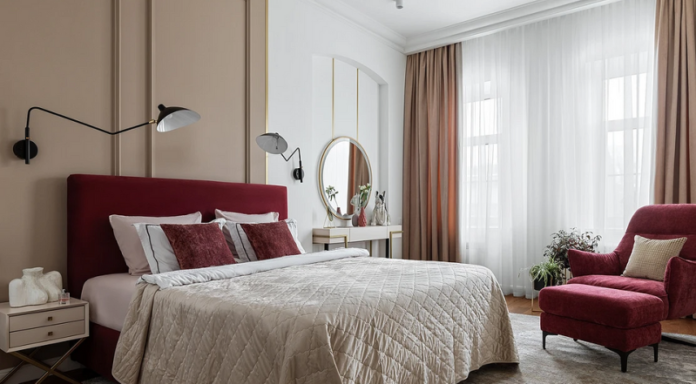 В спальне легкие занавески одновременно создают расслабленную камерную атмосферу и помогают регулировать поток света.
