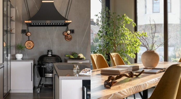 Гарнитур угловой с островом. Из техники выбрали большой двухдверный холодильник, предусмотрели винный холодильник, рабочую поверхность обустроили на острове, а мойку у окна. Конечно, не обошлось без барбекю. Здесь стоит современный гриль с мощной вытяжкой над ним. Обязательно посудомоечная машина.