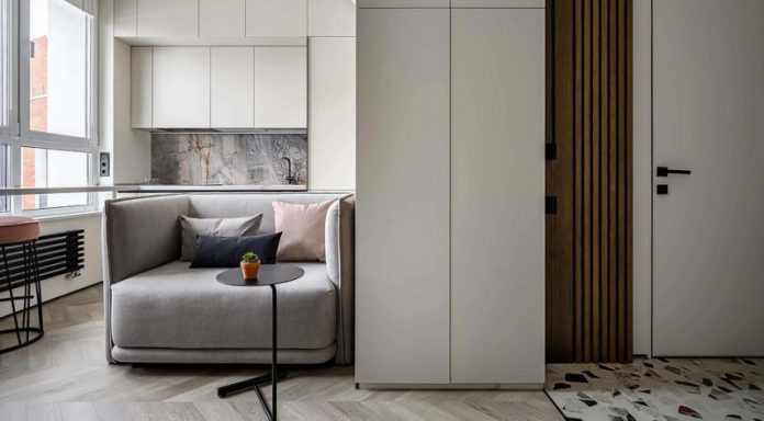 Еще один способ зонировать пространство с помощью отделки покрасить стены в разные оттенки. Такой вариант подойдет и любителям яркого интерьера, и приверженцам минимализма. Во втором случае можно скомбинировать, например, нейтральные белый и серый оттенки. Они создадут прекрасный графичный акцент и при этом зрительно разделят общее пространство.