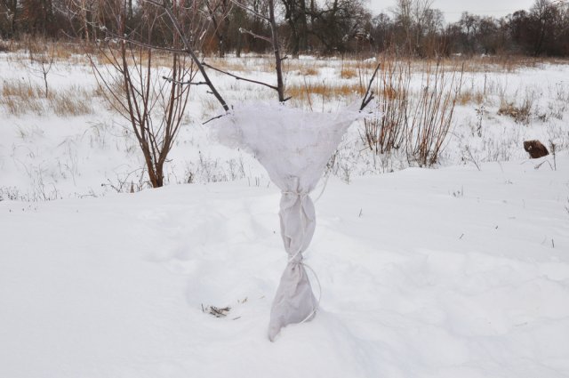 Колготки разрезают на две половины и каждую из них раскраивают продольно, а затем наматывают на стволы по тому же принципу, что и садовые бинты – двигаясь от комлевой части штамба вверх, оставляя небольшой напуск верхнего слоя на нижний. Для фиксации такого «укрывного материала» потребуется шпагат или толстая прочная нить, а можно просто спрятать конец полоски под натянутым полотном. Нижнюю часть ствола вместе с обмоткой следует окучить землей, торфом или перегноем.