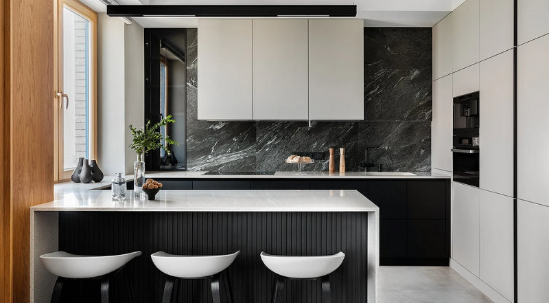 Подход к оформлению зоны готовки у всех разных: кто-то предпочитает теплые яркие оттенки, кто-то более сдержанный дизайн, где ничто не отвлекает от процесса. Черно-белая кухня подойдет если не всем, то многим: поклонникам минимализма, приверженцам классики, фанатам уютной сканди-эстетики. Все зависит от того, как обыграть эти цвета и чем дополнить. В статье расскажем об этом и покажем разные варианты использования ахроматической палитры.