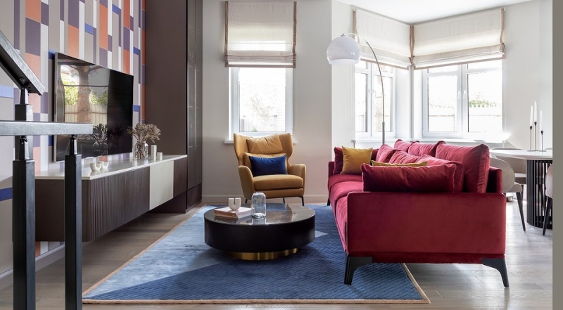 Интерьер получилось сделать ярким, современным, удобным и функциональным. Для каждого помещения разработана своя палитра, заказчики не боятся цветов. Основным декором стали обои, к которым подбиралась краска по выкрасам, ткани по образцам для штор и мебели. Для гостиной и спальни фиолетовые и лиловые оттенки. В спальне сына зеленые оттенки и акцентный яркий диван.