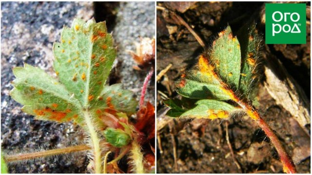 С развитием болезни пятна сливаются, листья садовой земляники покрываются оранжево-красным налетом, а затем опадают. После гибели растения споры грибка разлетаются по всему участку, поэтому важно не допустить распространения болезни по саду.