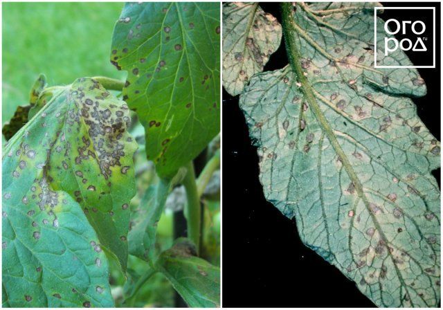 Симптомы. Листья томата покрываются мелкими темно-коричневыми и черными пятнышками круглой формы. Первыми поражение получают более старые листья. Со временем пятна переходят на стебли и плоды.