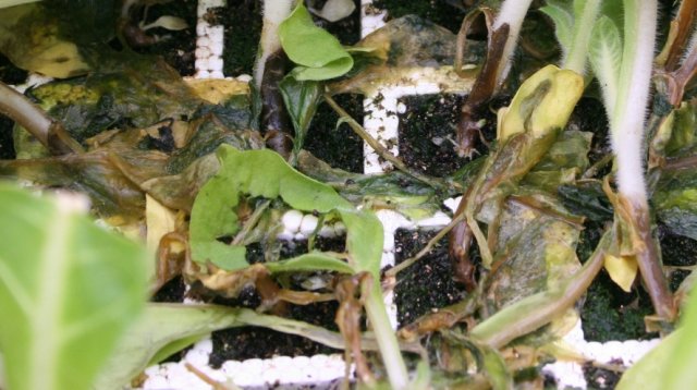 На наличие заболевания указывают бурый налет на корневой шейке рассады, истонченный стебель и побледневшие листочки. Растения, пораженные корневой гнилью, быстро погибают. Поэтому при обнаружении заболевания в первую очередь надо защитить здоровые экземпляры.