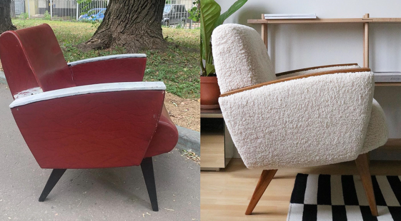 Из старого и полуразрушенного кресла удалось создать трендовый предмет интерьера. Благодаря интересной форме и плавным линиям эта мебель выглядит одновременно винтажно и футуристично. Но для того чтобы на выходе получить такой результат, пришлось заменить почти все составляющие: мягкую часть, обивку, подлокотники. Кроме того, отремонтировали и перекрасили деревянный каркас.