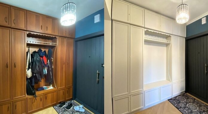 Следующее преображение, которое в варианте «после» напоминает шкаф из ИКЕА у шведского бренда были похожие фасады с рейками. До переделки это было уже привычное рыжеватое дерево. Белая краска сделала свое дело превратила устаревший шкаф в современную систему хранения.