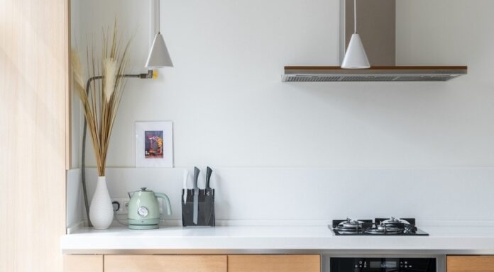 Минимализм это тренд последних лет, иногда дизайнеры в согласии с заказчиком выбирают полный отказ от верхних шкафов и не заполняют стены ничем. Так, как в этом проекте Яны Сахаревич. Над варочной поверхностью размещена только вытяжка.