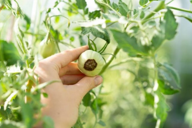 - вершинная гниль томатов – на «носике» появляются черные, медленно разрастающиеся пятна. Причина их появления – в бактериальных возбудителях либо недостатке кальция в почве, высокой кислотности или засоленности грунта, а также в нехватке поливов;