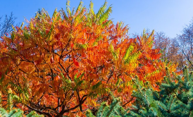 В роду Сумахов известно около 250 видов, среди которых есть безвредные и опасные (ядовитые) деревья и кустарники. В разных регионах России можно встретить сумахи голый, дубильный, трехлопастной, душистый и другие, менее популярные разновидности. В садах средней полосы чаще всего выращивают яркий и необычный сумах пушистый, или оленерогий. Мягкое серовато-коричневое опушение на молодых веточках делает их похожими на панты оленя, изящная резная листва меняет цвет с зеленого на огненно-красный или оранжевый в конце сезона, а пушистые соцветия, похожие на свечки, притягивают взгляд.
