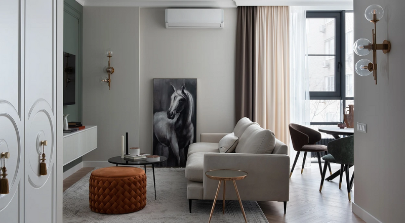 Неоклассику сейчас выбирают намного чаще, чем достаточно тяжеловесный классический стиль. И действительно, она лучше адаптирована под ритм современной жизни, а главное подходит для квартир любой площади. Дизайн кухни-гостиной в стиле неоклассика должен быть благородным и сдержанным, приветствуются симметрия, деревянные полы, лепнина. Палитра строится на нейтральных оттенках, но их можно разбавлять более яркими акцентами.