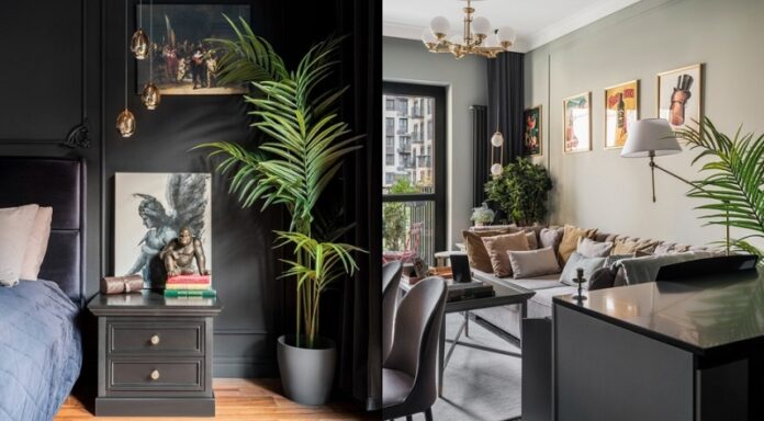 В спальне в черный выкрашен даже потолок. В кухне-гостиной графитовый совмещен с приглушенным зеленым цветом стен. В детской более насыщенный зеленый оттенок. Стены украшают молдинги, а потолки высокие карнизы и лепные розетки.