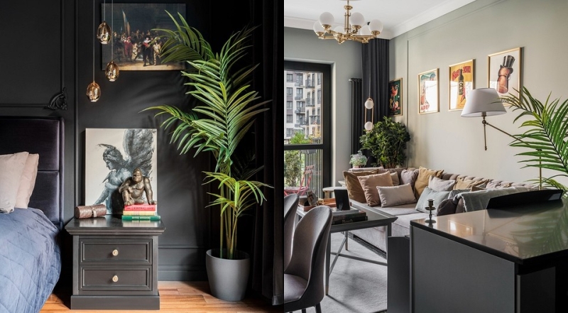 Для отделки стен и потолком дизайнер выбрал краску. В основном, это насыщенные темные оттенки. Прихожая и мастер-спальня в темных тонах.