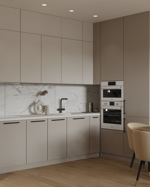 Любой материал с минимальным количеством швов будет проще поддерживать в чистоте, чем такой же, но со стыками. В них, даже если они идеально смонтированы, будут попадать вода, жир, грязь и пыль, вычистить которые впоследствии довольно сложно. Особое внимание уделите зоне мойки и плиты. Отделка рядом с ними должна иметь как можно меньше швов по крайней мере на расстоянии 30 сантиметров от раковины и варочной поверхности.