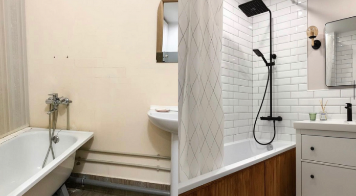 Эта ванная занимает площадь в 4,2 квадратных метра. До переделки интерьера как такового не было только частичная отделка и некоторая сантехника. В процессе ремонта стены облицевали плиткой «кабанчик» белого цвета, к ней выбрали контрастную темную затирку получился будто бы геометрический рисунок. Для пола использовали покрытие с узором в стиле пэчворк. Белая мебель и кремовая краска для стен поддерживают общее ощущение светлого и воздушного пространства, а теплоты добавляет рыжеватый оттенок древесины, которой отделана часть ванны.