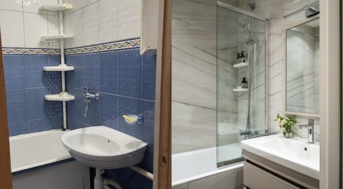 Эта квартира также расположена в типовом панельном доме. Ее преобразила дизайнер Милена Яничкина для девушки. До переделки ванная комната представляла собой обычное пространство с комбинацией белой и голубой плитки, а также плиточным декором модный прием из 2000-х.