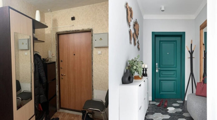 Эта прихожая точно нуждалась в преображении: неактуальная отделка, старые межкомнатные двери и большое количество вещей. Новый интерьер кардинально отличается от предыдущего. Прихожая получилась яркой и стильной: поставили изумрудную входную дверь, пол выложили шестиугольной плиткой и инженерной доской, добавили светлую мебель. Зеркальные поверхности традиционный прием для небольших пространств зрительно делают входную зону более воздушной и просторной.