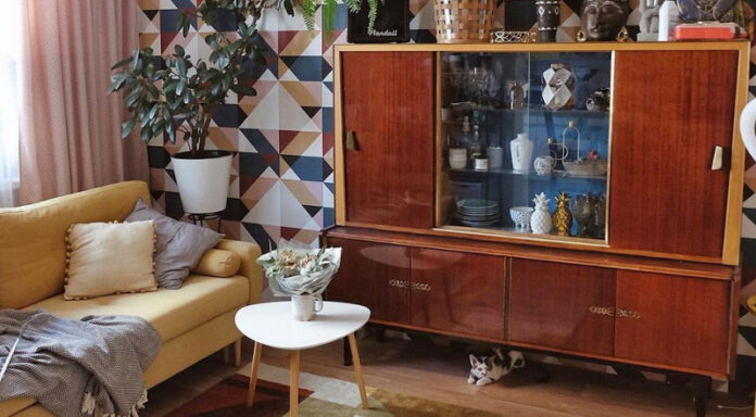 До переделки стул представлял собой типичную офисную мебель: блеклая расцветка, невыразительная фактура и потрепанное состояние привлекательного мало. В итоге благодаря обивке с активным геометрическим узором он превратился в яркий акцент. Основание сидения перекрасили в светло-серый цвет так стул выглядит более уютно и лучше подходит для жилого помещения. Теперь его можно использовать в столовой зоне или поставить к рабочему месту. Идеальный интерьер для такой мебели светлый, спокойный, без лишних цветовых пятен.