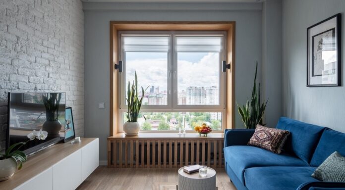 Интерьер в стиле экоминимализм основан на принципах домашнего уюта с легкой ноткой воспоминаний о путешествиях. Он создан для девушки, увлеченной своей работой (которая за годы пандемии перенеслась домой). Идея интерьера идет от двух окон, отороченных дубовыми откосами по периметру. Акцент на окна неслучаен. Квартира находится на 20-м этаже, и из окон открывается прекрасный вид на город, который является одним из главных украшений.