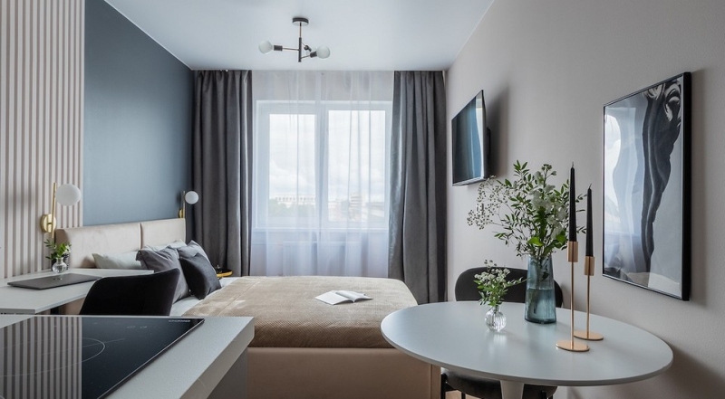 Эта студия находится в апарт-комплексе и предназначена для сдачи в аренду. Перед дизайнером Екатериной Шейн хозяева ставили задачу создать эффектный интерьер без использования ярких цветов. А также практические требования: уместить двуспальную кровать, небольшую кухню с холодильником и СВЧ-печью, рабочий стол, чтобы среди потенциальных арендаторов были и фрилансеры, а также те, кто приезжает в город по работе. Нужно было предусмотреть шкаф для хранения и хозяйственное помещение, где поместятся принадлежности для уборки.