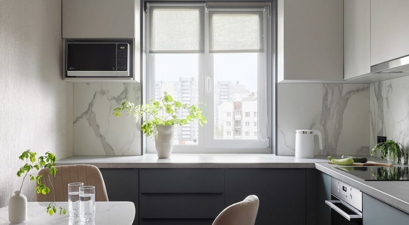 Кухонный гарнитур сделали угловым и задействовали стену с окном. Так подоконник стал частью рабочей поверхности. Гарнитур получился вместительным, здесь есть вся необходимая техника и место для хранения, а в углу при входе стоит большой двухдверный холодильник.