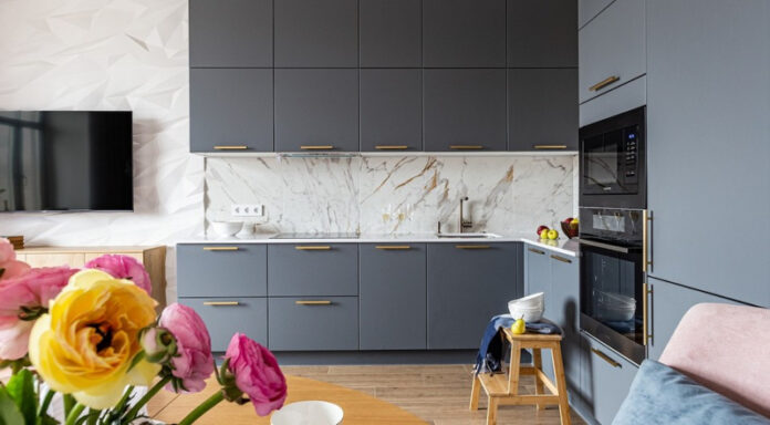 В кухне-гостиной подвесной светильник позволяет создать атмосферное освещение над обеденным столом в темное время суток, а торшер расслабленное настроение в диванной зоне. Кухонный гарнитур подсвечивается дополнительно, что важно в зоне готовки.