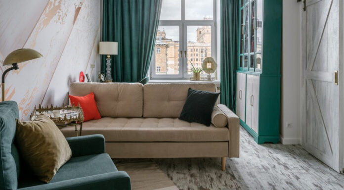 Общий сценарий освещения решен точечными светильниками, которые регулируются по системе «умного дома»: можно выбрать яркость и цвет. Продумали и дополнительные сценарии. Старинная люстра, которая теперь висит в гостиной, наследие хозяев квартиры. Ее отреставрировали и заменили плафоны на изумрудные а к ней уже подобрали другое освещение в квартире в том же изумрудном оттенке: бра в коридоре, подвесные светильники по бокам от кровати в спальне. Еще один винтажный предмет освещения: торшер в гостиной, который нашли на блошином рынке. Кроме него, дополнительным сценарием света стала настольная лампа.