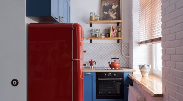 На маленькой кухне такой же компактный кухонный гарнитур. Отдельно стоящий красный холодильник Smeg акцентное решение. Верхние шкафы сделали только по одной стене, а вторую дополнили открытыми полками для хранения круп и декора (сейчас полку украшает портрет трех хозяйских котов), чтобы не утяжелять пространство.