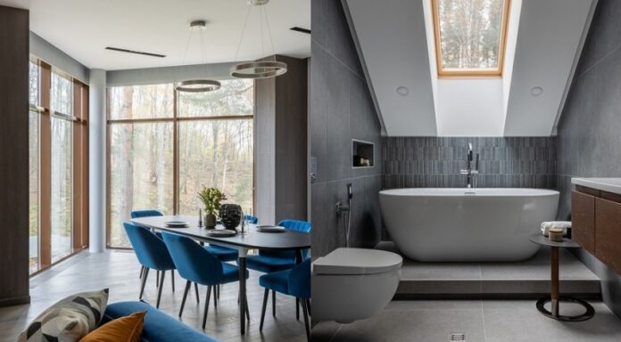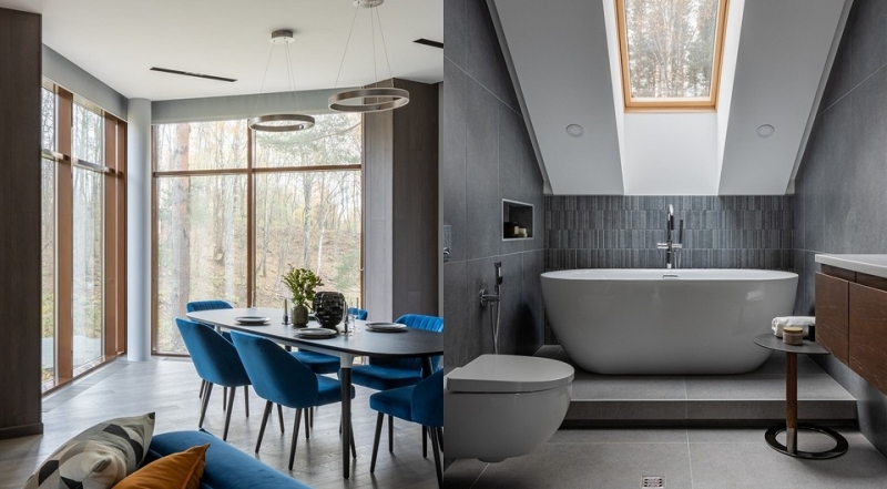 Монохромный серый интерьер с богатыми фактурами «приглашает» к размеренной и спокойной загородной жизни.