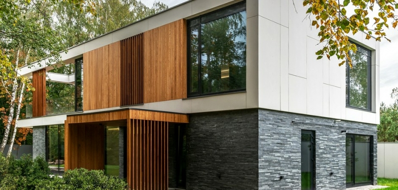 Площадь дома — 362 квадратных метра (без террас, но включая все подсобные помещения). Это проект в стиле хай-тек, с минималистичной архитектурой: строгие линии без лишних украшательств, сдержанные, но хорошо подобранные цвета. Фасад отделан термососной и натуральным сланцем. У дома эксплуатируемая плоская кровля с аэродинамическими свесами, две террасы. Однако главная его особенность — обилие светопрозрачных конструкций, которые дают ощущение невесомости.