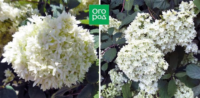 Соцветия крупные (до 20-25 см см), полушаровидной формы, из мелких, порядка 1 см, стерильных цветков. Цвет с начала распускания отчетливо зеленовато-белый, затем меняется со временем до белоснежного. Цветение очень обильное, на побегах текущего года, с июля по октябрь. Требует ежегодной обрезки. В фазу полного раскрытия цветков куст может «разваливаться» под тяжестью побегов.