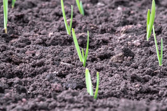 Первую подкормку озимого чеснока проводят ранней весной, когда полностью оттает почва и на поверхности покажутся зеленые ростки. В этот период культура нуждается в большом количестве азота, который будет стимулировать рост наземной части растений.
