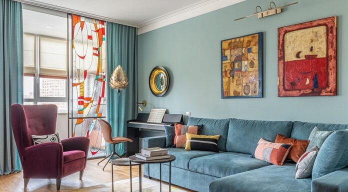 В основе оформления современная классика с ее неизменными потолочными карнизами, филенчатыми белыми дверями, высоким белым плинтусом. В эту традиционность словно врываются импровизации на тему авангардного искусства (витраж, картины, ковер, мебель кубических форм). Все это дополнено креслом и стульями в стиле mid-century modern, фантазийными светильниками.