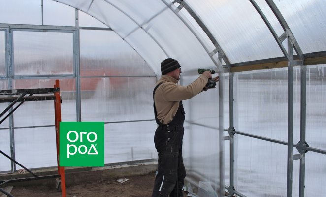 Длина листов поликарбоната зависит от размера теплицы. Для нашей теплицы нужны были листы длиной 9 м. Мы заказали их на производстве (у производителей поликарбоната или у официальных представителей можно заказать листы длиной до 12 м). Листы нужной длины монтировать изнутри теплицы очень удобно и быстро, к тому же там не будет стыков, которые придется потом дополнительно герметизировать.