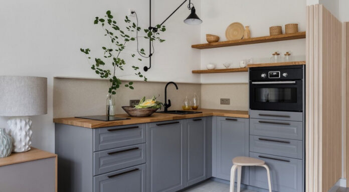 На кухне в экостиле должны быть лаконичный и надежный гарнитур, обеденная группа со столом или барной стойкой и стульями, а также при необходимости дополнительные системы хранения. Для зоны готовки подойдут дерево, МДФ, плитка или краска для фартука, камень, массив или керамика для столешницы. Хорошо будут смотреться плетеные стулья, деревянные или фанерные полочки, кантри-элементы.