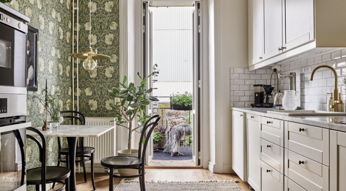 Эта кухня в традиционном скандинавском стиле сразу вызывает интерес. Когда нет ощущения, что интерьер создали вчера с нуля, создается тот самый вау-эффект даже если на самом деле у дома нет длинной истории. Деревянный стол и стулья, чуть потертый бархатный диван, хрустальная люстра под потолком и картины в винтажных рамах задают правильную атмосферу.