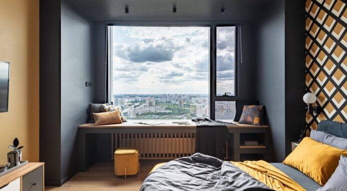 Эта студия в московском ЖК «Небо» предназначается для сдачи в аренду, и основной задачей для дизайнеров Вадима и Екатерины Бычковых было создать запоминающийся интерьер, который бы выделился среди других. По функционалу было необходимо продумать спальню, кухню со столовой, рабочее место, комфортную ванную все, чтобы арендатору (или паре) было удобно.