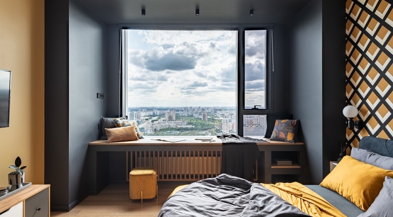При создании проекта мы вдохновлялись архитектурой здания, в котором он расположен, советским конструктивизмом и работами Пабло Пикассо. Цветовая палитра сложилась из трех основных оттенков: серо-голубой, горчичный цвет и антрацит. Серо-голубой оттенок — в зоне прихожей и ванной комнате. Горчичный оттенок был подобран в цвет геометрических обоев над кроватью, которые являются главным акцентом в этом проекте. Антрацит был подобран в цвет оконного профиля от застройщика, который не меняли. Этот цвет использован в рабочей зоне у окна, а также в покраске плинтуса.