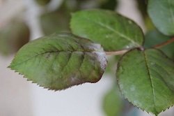 Округлые пурпурно-бурые, постепенно чернеющие пятна на листьях. Сбор и сжигание опавших листьев осенью, рыхление грунта после наступления холодов. Троекратная обработка роз по инструкции фунгицидами Ракурс, Топаз, Скор. |