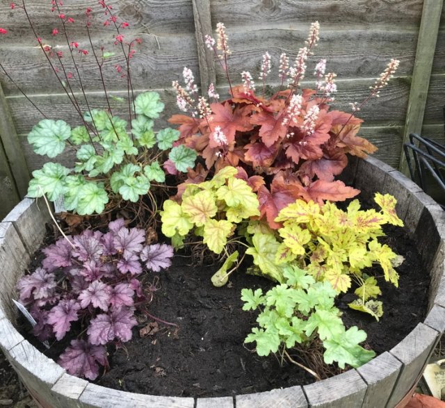 На фото справа налево в первом ряду сорта гейхереллы: Solar Eclipse, Tapestry, Can Can. Во втором ряду: Mojito, Quicksilver, Golden Zebra