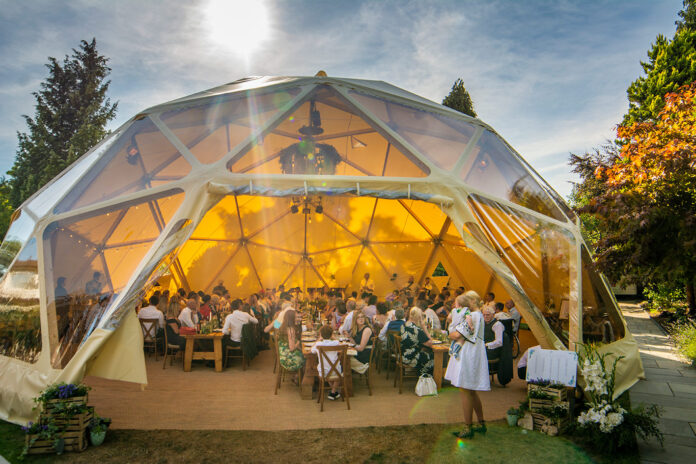 Сочетание треугольных элементов делает дизайн уникальным. Шатры представляют собой идеальные полусферы в целом. Ряд структурных соединений соединяет и фиксирует арки, что также позволяет подключать системы освещения и аудио-видео оборудование.