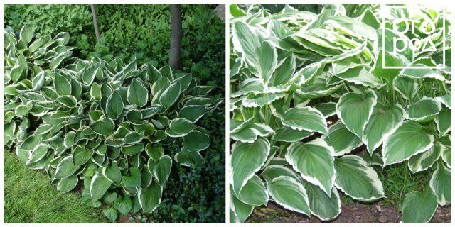 Этот сорт хосты вздутой отличается разноцветными листьями: центр листовой пластины светлый, желтовато-зеленый, с зелеными, кремовыми, желтыми полосками, а края листа ограничены темной каймой. К концу лета кустики зеленеют. В тени же быстро теряют свою пеструю окраску.