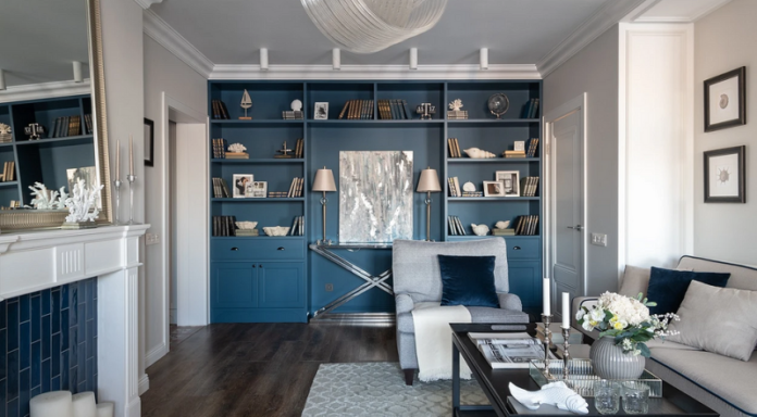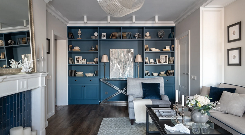 В дополнение к ним или вместо бежевого иногда используют голубой либо светло-серый. Если принято решение использовать насыщенный акцент (это может быть что-то из мебели или предмет декора), тона выбирают благородные и солидные: пурпурный, кобальтовый, изумрудный, океанический синий и т.д.