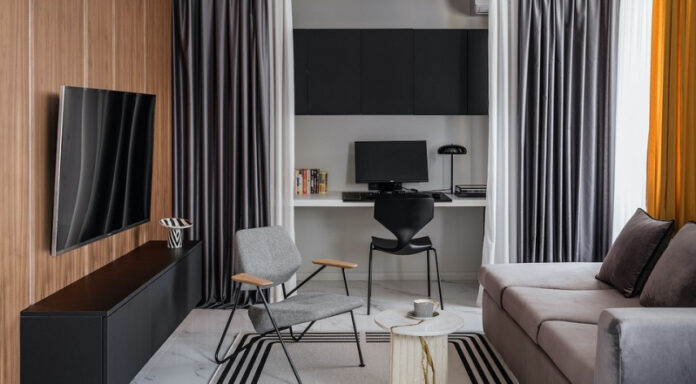 Дизайнер использовала контрастные цвета, зеркала и другие приемы визуального увеличения пространства, а еще вписала рабочую зону в гостиной, деликатно закрыв ее шторами. Выглядит стильно, красиво и дорого!