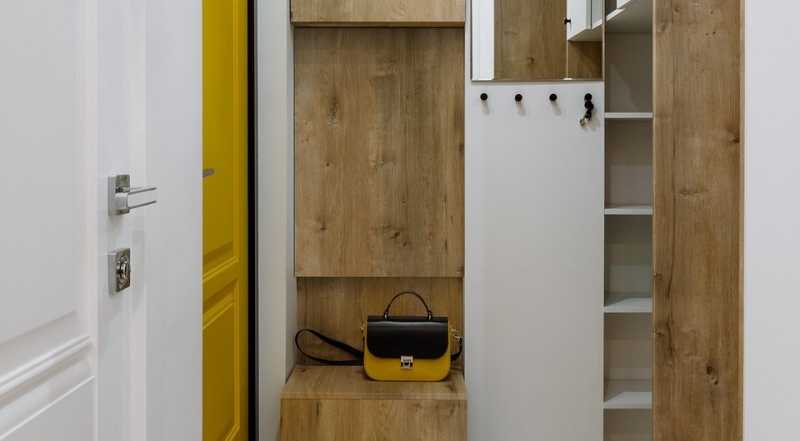 Выделить хотя бы пару квадратов можно даже в небольшом пространстве. Одно из лучших мест для этого (наряду со спальней) в прихожей, ведь именно здесь обычно хранится большой массив вещей. Наличие отдельного помещения, пусть и маленького, позволяет: