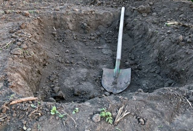 - если яма неглубокая, снимите верхний слой почвы, отложите его в сторону;