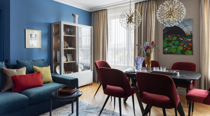 Что касается цвета его использовали по зонам. Так, просторная общая гостиная-кухня стала синей. Этот цвет продолжился в гостевой комнате и частично в детской. В комнате сына его поддержали теплым оранжевым оттенком, который отлично смотрится при естественном освещении (это одна из самых солнечных комнат в квартире). Спальню заказчиков и прихожую оформили в светлых тонах, серых, но с яркими акцентами. В спальне таким акцентом стали обои с природным рисунком в зеленых цветах, а в прихожей банкетка и спинка ей в тон бордового цвета. Гостевой санузел же, кроме плитки на стенах, украсили обои с рисунком рыб.