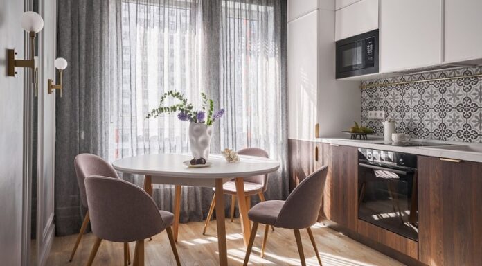 Для отделки кухни-гостиной выбрали краску для стен, которые также декорировали молдингами и зеркалами, и ламинат для пола. Дизайнер не стала выделять кухню плиткой, чтобы не дробить небольшое пространство. Вместо этого для зонирования использовали цвет. Зона гостиной выделена ярким синим цветом, который повторяется в других помещениях общей зоны.